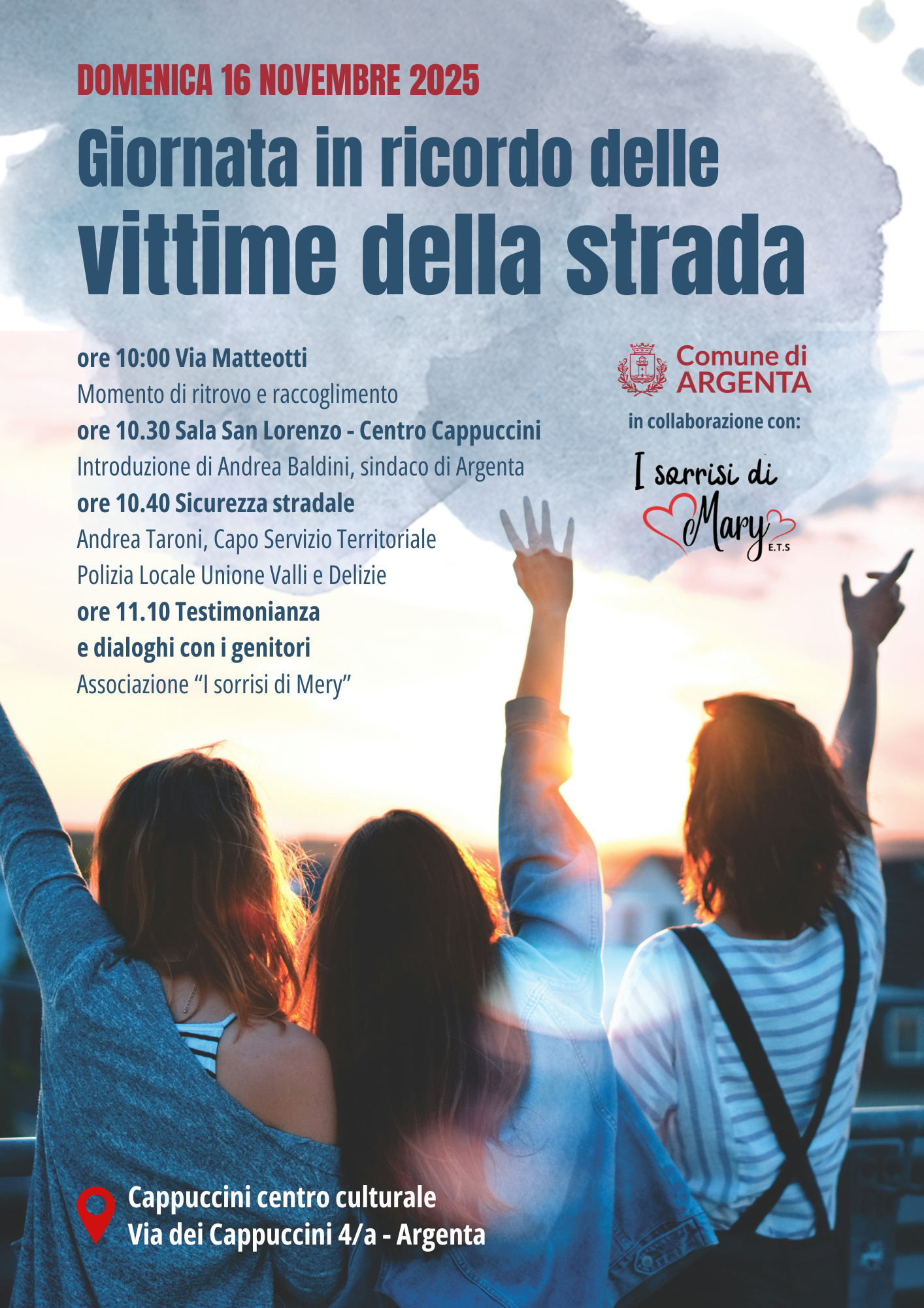 In occasione della Giornata in ricordo delle vittime della strada, il Comune di Argenta organizza, in collaborazione con l’associazione I sorrisi di Mery, domenica 16 novembre, un incontro commemorativo presso il Centro Culturale Cappuccini di Argenta, nella sala San Lorenzo.