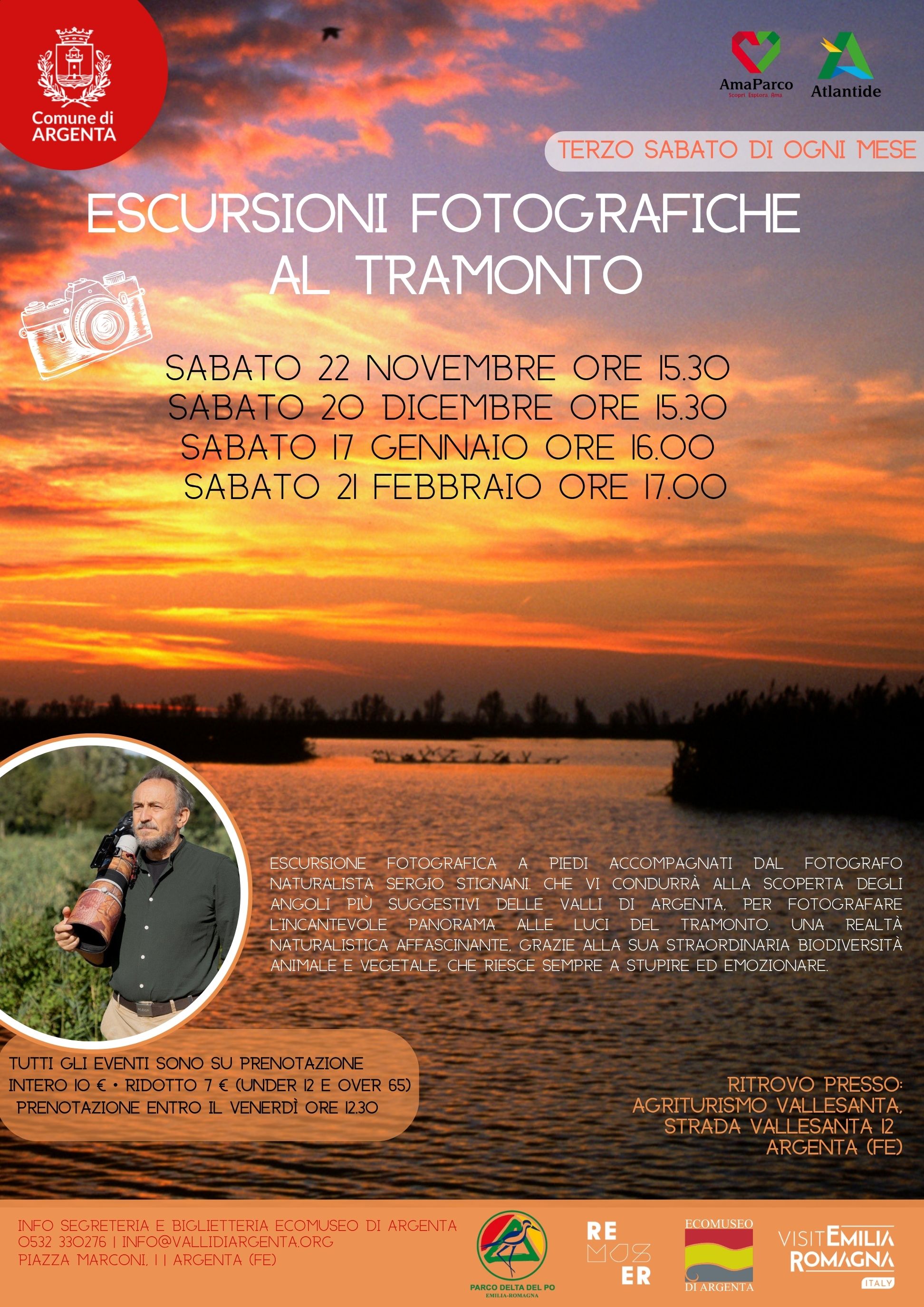 Escursione fotografica al tramonto 📷Sabato 22 novembre ore 15.30Escursione fotografica a piedi accompagnati dal fotografo naturalista Sergio Stignani, alla scoperta degli angoli più suggestivi delle Valli di Argenta per fotografare l’incantevole panorama alle luci del tramonto. Magici e suggestivi “scatti” che documentano la ricchezza e la bellezza del Parco del Delta del Po Emilia-Romagna; una realtà naturalistica affascinante grazie alla sua straordinaria biodiversità animale e vegetale, che riesce sempre a stupire ed emozionare.