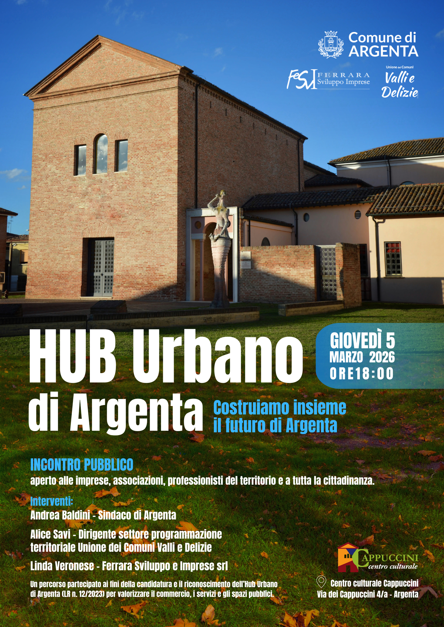 Giovedì 5 marzo alle ore 18.00, presso il centro culturale Cappuccini di Argenta, si terrà un incontro pubblico aperto alle imprese, associazioni di categoria, culturali e sportive, professionisti e cittadinanza per illustrare il percorso di riconoscimento dell’Hub Urbano di Argenta. L’iniziativa rappresenta un momento di confronto e condivisione sul percorso che l’Amministrazione comunale sta mettendo in atto per lo sviluppo dell’economia urbana, la qualificazione e l’innovazione della rete commerciale e dei servizi del territorio.