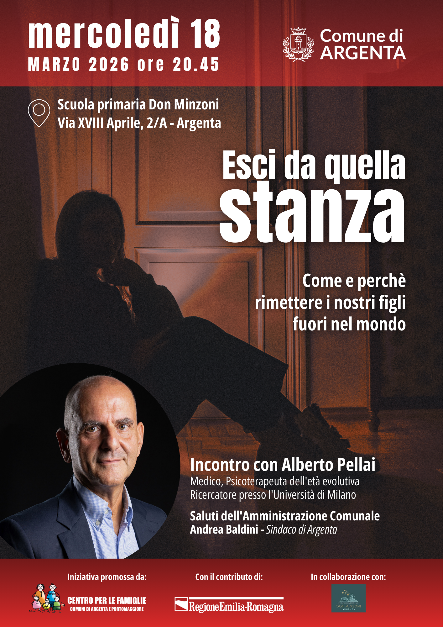Mercoledì 18 febbraio alle ore 20.45 ad Argenta, presso la📍Scuola primaria Don Minzoni in Via XVIII Aprile 2/A, si terrà un incontro con Alberto Pellai, medico, psicoterapeuta dell'età evolutiva, ricercatore presso l'Università di Milano dal titolo: Esci da quella stanza - Come e perché rimettere I nostri figli fuori nel mondo.