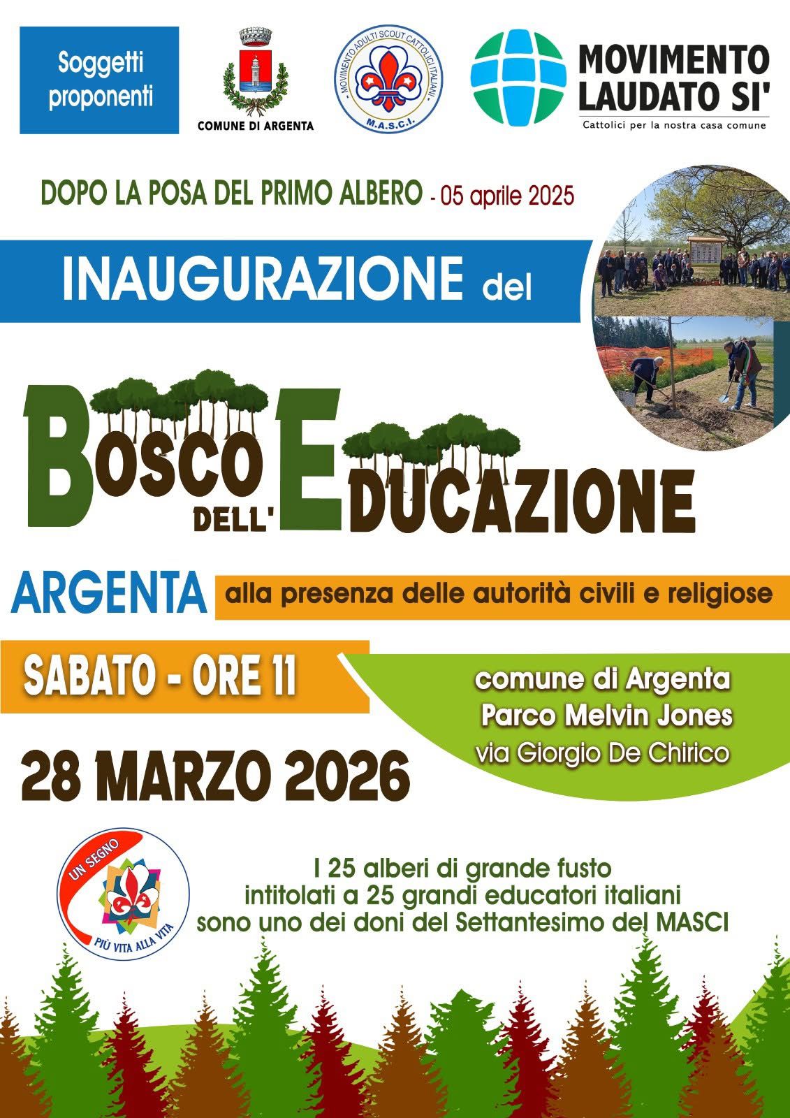 Comune di Argenta, MASCI - Movimento Adulti Scout Cattolici Italiani per i suoi 70 anni di vita e il Movimento Laudato Si', rappresenta un segno concreto di attenzione verso le nuove generazioni e di impegno e attenzione per l’ambiente.