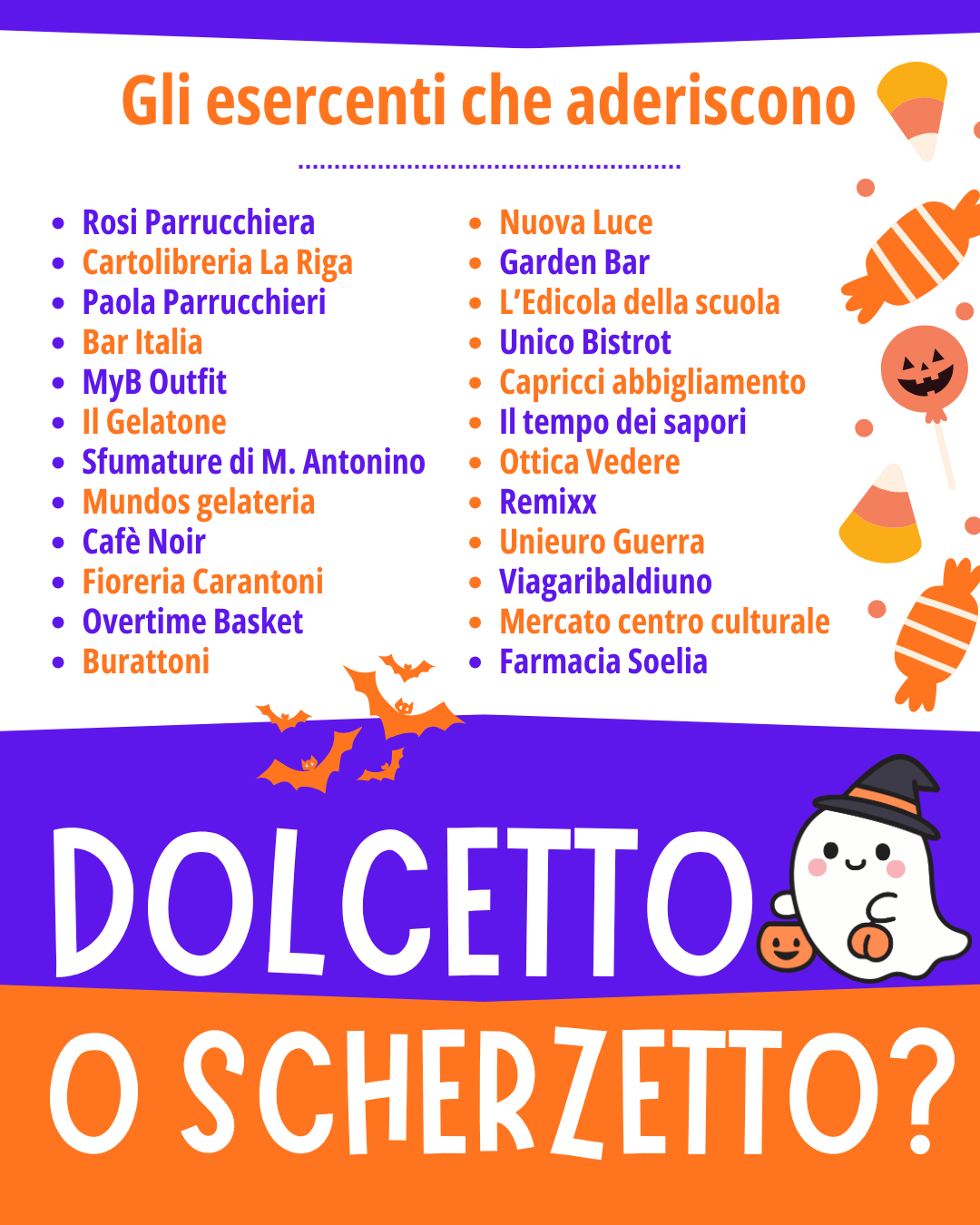 Gli esercenti che hanno contribuito ad Halloween Contest dedicato a ragazze e ragazzi delle scuola medieCarolina Cavedagna, Rosi Parrucchiera, Cartolibreria La Riga, Paola Parrucchieri, Bar Italia, Garden Bar, MyB Outfit, I viaggi dell’acquario, Il Gelatone, Sfumature di Maria Antonino , Cafè Noir, GymH24, Fioreria Carantoni, Fabio Saletti geometra, L’Edicola della scuola, Unico Bistrot, Capricci abbigliamento, Il tempo dei sapori, Ottica Vedere, Remixx, Il Miele del Casetto e Unieuro Guerra.