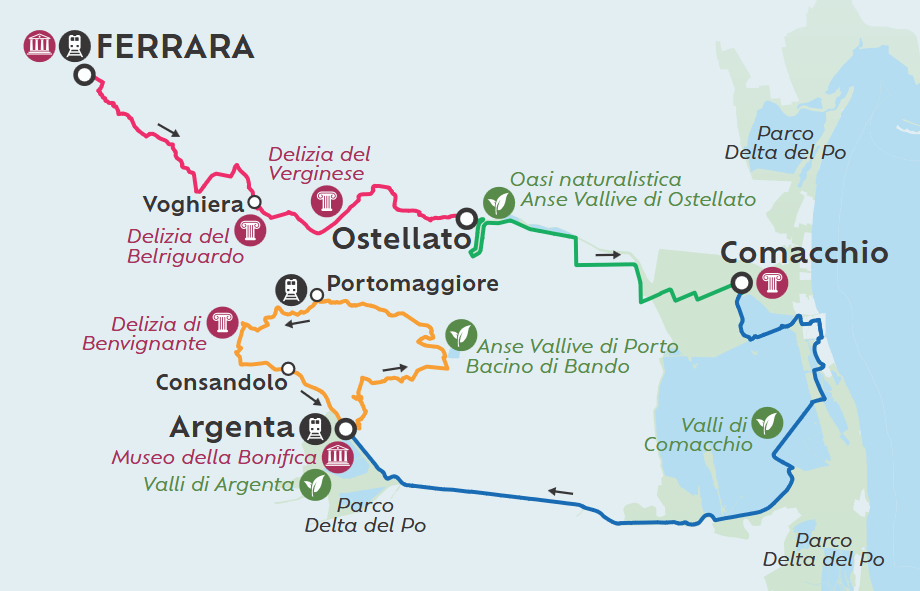 Il percorso è nato dalla collaborazione tra Visit Ferrara e i Comuni dell’Unione Valli e Delizie ed è pensato per tutti, grazie a un tracciato prevalentemente pianeggiante che si sviluppa tra ciclabili, strade a bassa percorrenza e argini sterrati, offrendo un’esperienza lenta e autentica nel cuore del Parco Regionale del Delta del Po, Patrimonio UNESCO. Il cicloturismo diventa così motore per la promozione e lo sviluppo sostenibile del territorio.