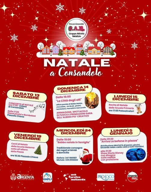 𝗡𝗮𝘁𝗮𝗹𝗲 𝗮 𝗖𝗼𝗻𝘀𝗮𝗻𝗱𝗼𝗹o 2025 Consandolo si prepara ad accogliere la magia del Natale con una serie di eventi dedicati a grandi e piccini, per un mese pieno di divertimento!Dal 13 dicembre al 5 gennaio, un Natale ricco di emozioni, tradizioni e divertimento per tutta la famiglia, organizzato da Pro Loco GAN ConsandoloLeggi il programma completo!
